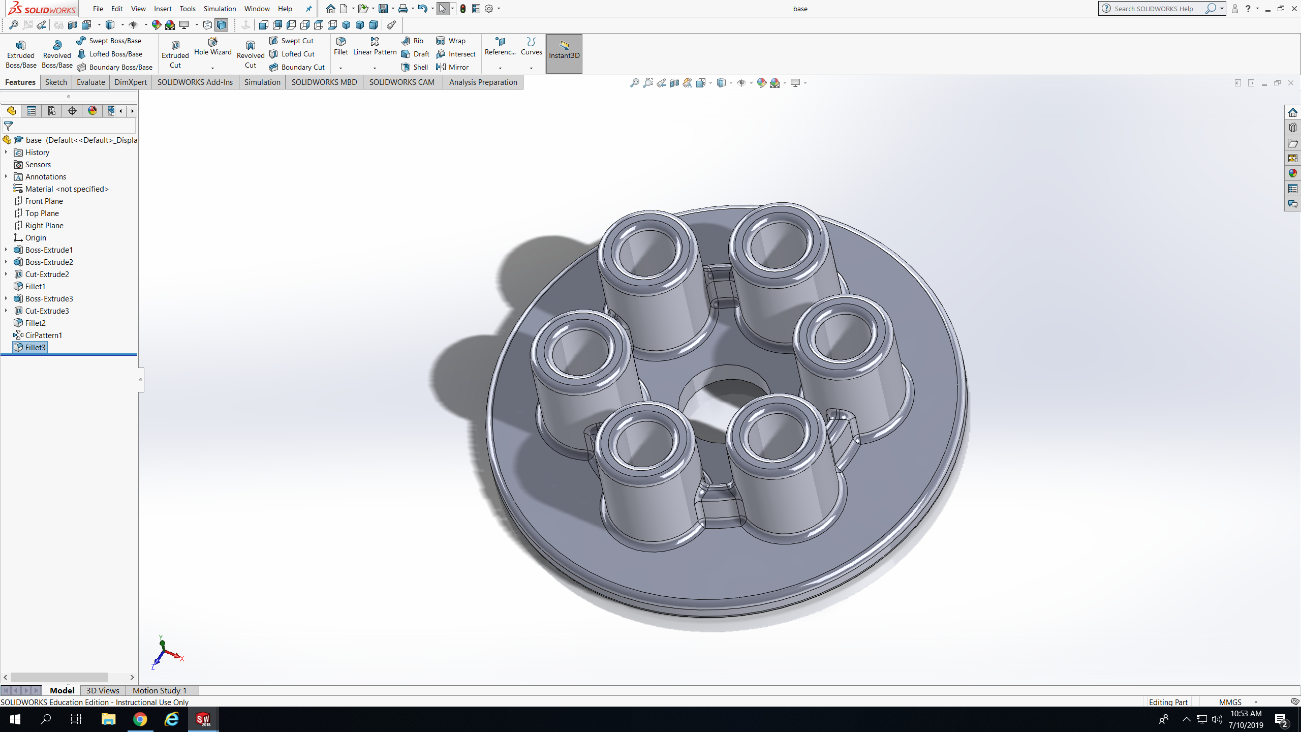 Today I learned how to assemble the parts. I followed the steps of the tutorial on the SolidWorks to make the model down below. Also I learned how to make a blueprint. I find SolidWorks getting easier to learn compared to the first day when I started because I know where everything is almost and what each thing does like extrude cut and fillet. They mean that it cuts the part and to make the edges smooth. On the first day i had trouble finding where everything is and what they do.