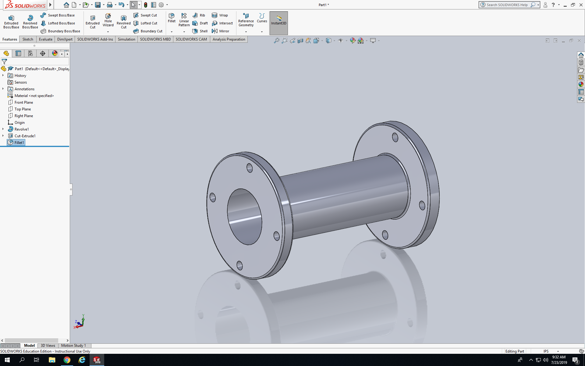 Today I learned how to make/sketch a Schedule 40 Pipe. First I drew half of the pipe using lines. Then I smart dimension it, fix the measurement. After that I clicked revolve boss/base which revolves the drawing all the way around. And then I drew circles on the side to make holes. At the end i filleted the edges. Also today I learned how to make/sketch a candle holder by following a tutorial. At first i did the same thing with the pipe, I drew half of the candle holder using lines and curves and smart dimension it. And then I revolved it. After that I drew a handle using lines and curves also, I clicked swept boos/base which extrudes curved features. At the end I made a circle at the top and cut extruded it to put a candle in it.