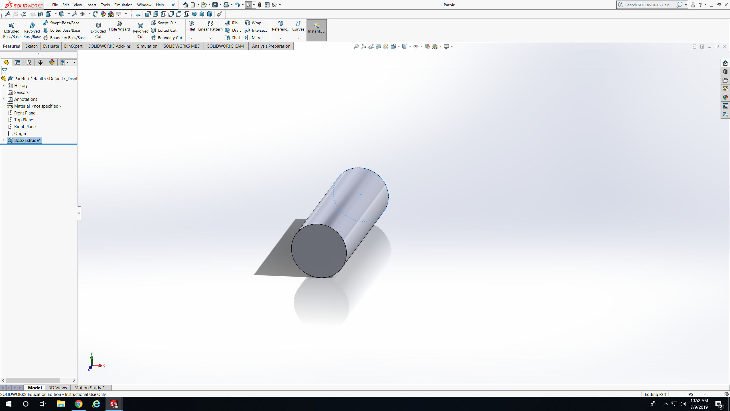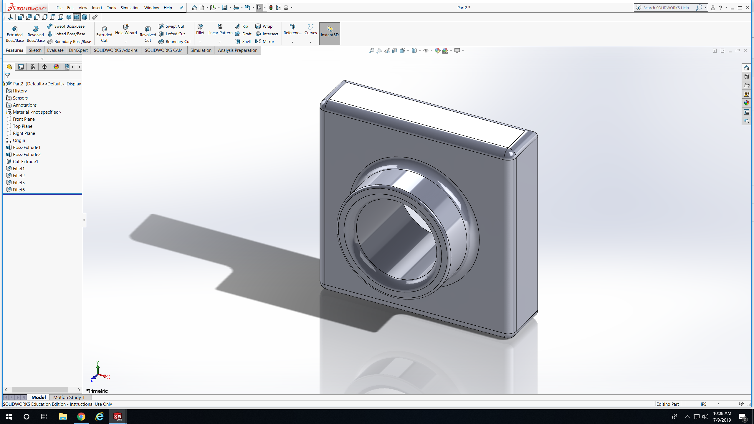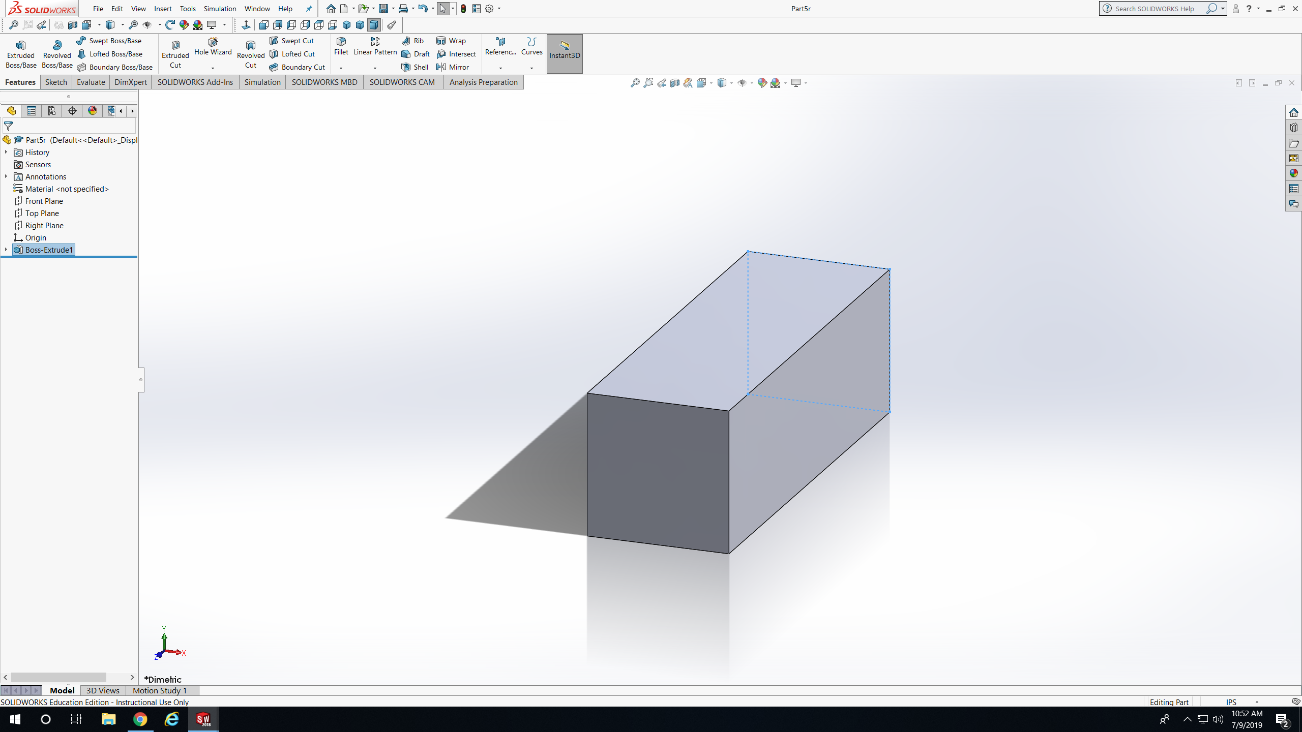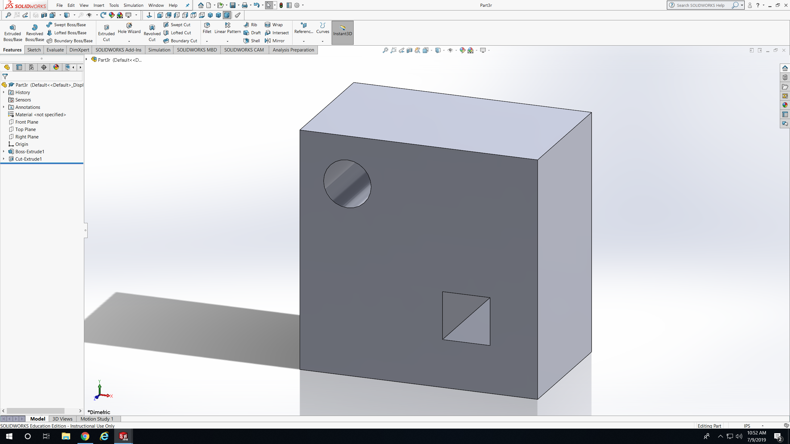 Today we were introduced to the assembly and part drawing functions within SolidWorks. Below, I will explain how both the assembly and part drawing processes work: I didn’t get to the assembly process yet. The part drawing process is complicated at first for a beginner. The instructions are very precise, you have to follow them carefully. I learned how to make holes in shapes which is called extrude cut. Also how to fillet which is basically smoothing the edges. Next class I would get to learned how to assemble the parts I sketched.